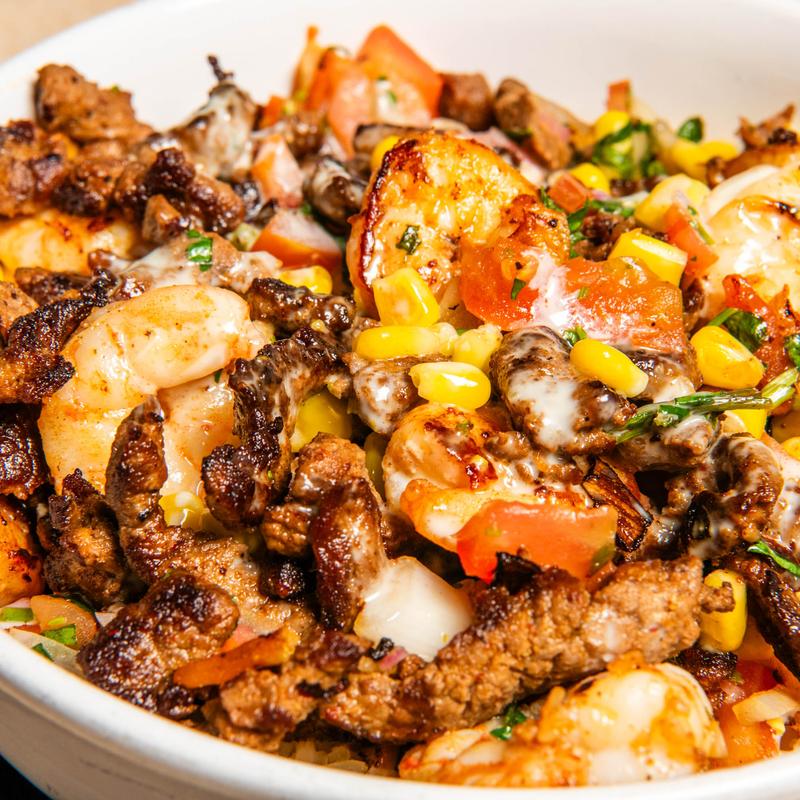 All house bowls are served with white rice, black beans, lettuce, tomatoes, shredded cheese, corn salsa, and tortilla strips.